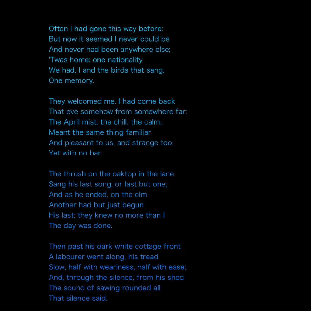 This is Thomas’s poem “Home: Often I had gone this way before” which is a fitting Eulogy to the countryside around Steep within which the Harrow and Bedales sit.