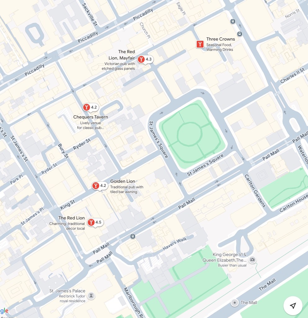 On the subject of pubs, there is a remarkable concentration of them just off Pall Mall / Piccadilly and around St JamesSquare. Check out this screenshot from Google Maps – there are five including two Red Lions!