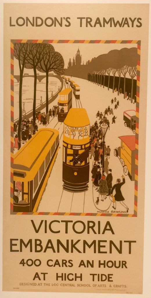 The collection of tram posters at the London Archives was fascinating. I do love old London posters. My favourite was the one about “400 trams an hour at High Tide” along the Embankment. What could the tide have to do with the running of the trams? But apparently trams operating on the Embankment were a significant part of London’s public transport network in the early 20th century, with some routes specifically designed to handle high tide conditions.