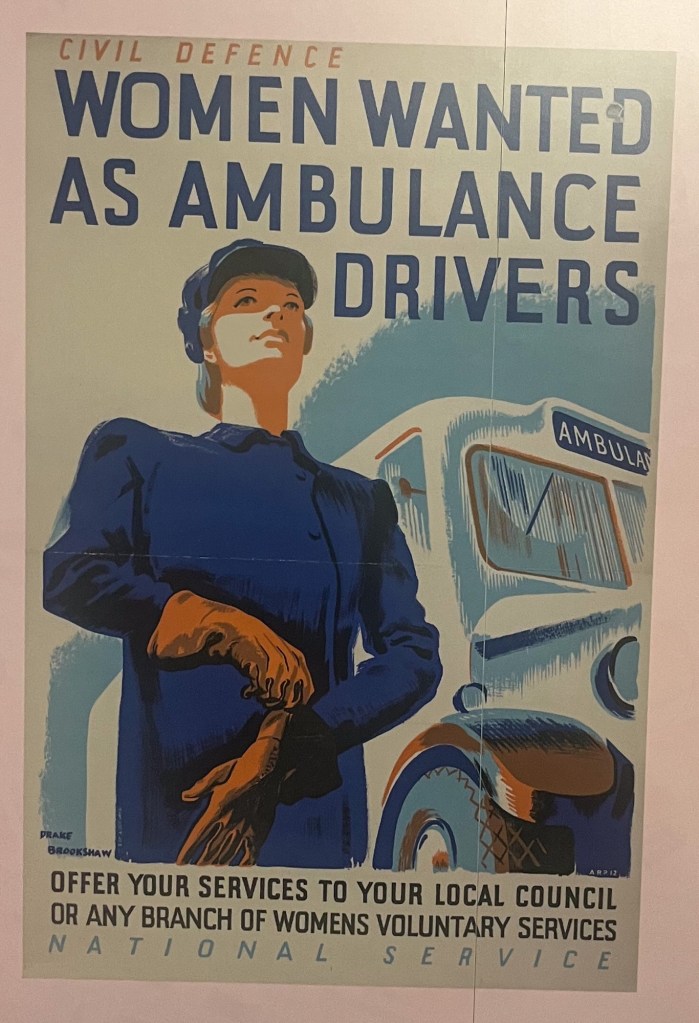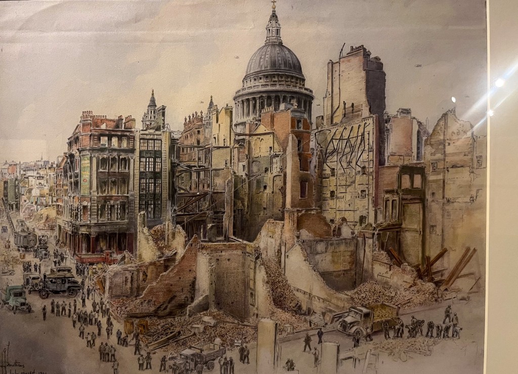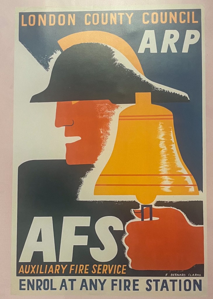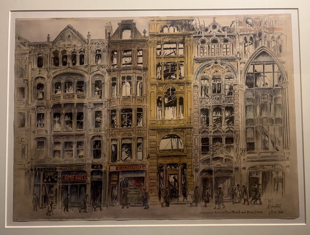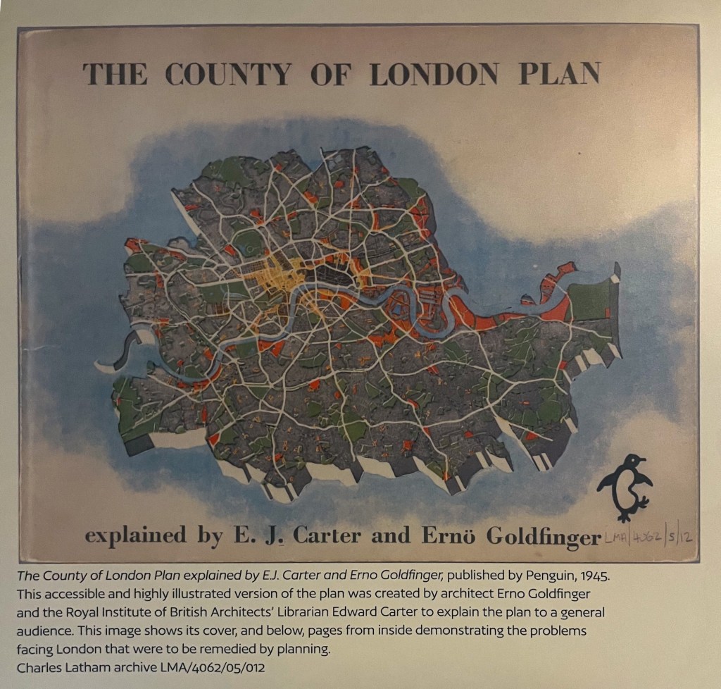 The London in WW2 exhibition at the London Archives was small but fascinating. Of particular interest were the photographs by two London policemen who were enthusiastic amateur photographers, and the paintings by London based artists. Also of interest was the planning for post war London – the enormously optimistic post reproduced here really does show you that people had hopes for a brave new world.