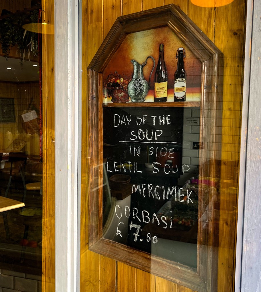 My collection of odd shots today is below. I particularly like the Turkish cafe advertising ”Day of the Soup” as if it was the day when oppressed broth rises up to defeat humanity. But the magic shop also caught my eye – I didn’t dare go in as the staff looked like they wouldn’t let you out again – and you had to like the flowerpot men at Waterloo. What a way to make a living.